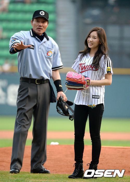 27일 오후 서울 잠실야구장에서 열린 2013 한국야쿠르트 세븐프로야구 LG 트윈스와 넥센 히어로즈의 경기, 경기에 앞서 소녀시대 태연이 시구 전 최규순 구심의 설명을 듣고 있다.