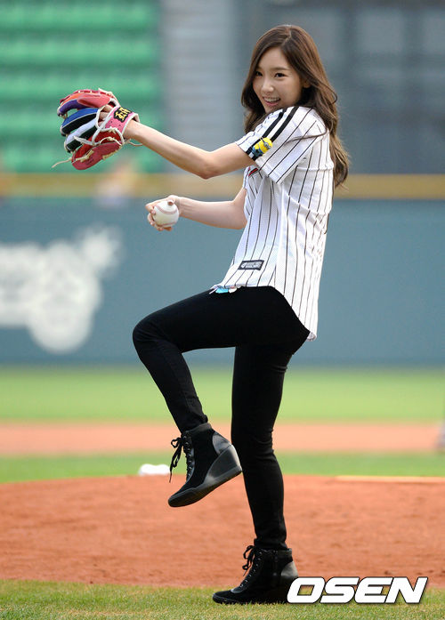 27일 오후 서울 잠실야구장에서 열린 2013 한국야쿠르트 세븐프로야구 LG 트윈스와 넥센 히어로즈의 경기, 경기에 앞서 소녀시대 태연이 시구를 하고 있다.