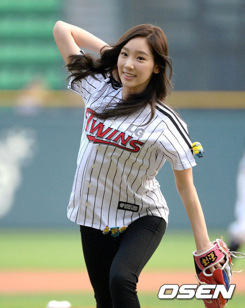 27일 오후 서울 잠실야구장에서 열린 2013 한국야쿠르트 세븐프로야구 LG 트윈스와 넥센 히어로즈의 경기, 경기에 앞서 소녀시대 태연이 시구를 하고 있다.
