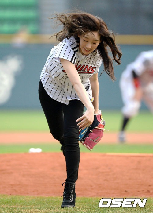 27일 오후 서울 잠실야구장에서 열린 2013 한국야쿠르트 세븐프로야구 LG 트윈스와 넥센 히어로즈의 경기, 경기에 앞서 소녀시대 태연이 시구를 하고 있다.