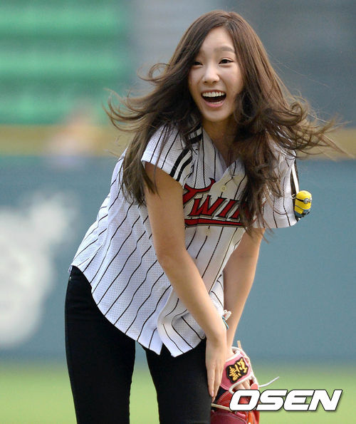 27일 오후 서울 잠실야구장에서 열린 2013 한국야쿠르트 세븐프로야구 LG 트윈스와 넥센 히어로즈의 경기, 경기에 앞서 소녀시대 태연이 시구를 하고 있다.
