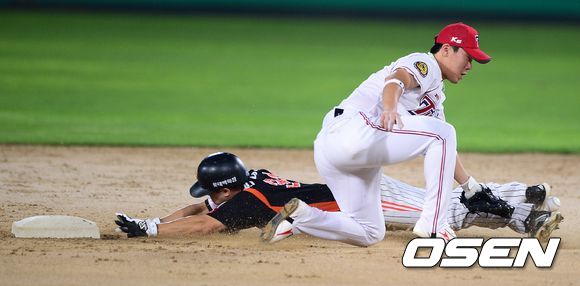 27일 오후 광주 무등경기장에서 열린 '2013 한국야쿠르트 세븐 프로야구' KIA 타이거즈와 롯데 자이언츠의 경기, 3회초 2사 1루에서 롯데 손아섭이 KIA 안치홍의 태그에 앞서 2루 도루에 성공하고 있다.