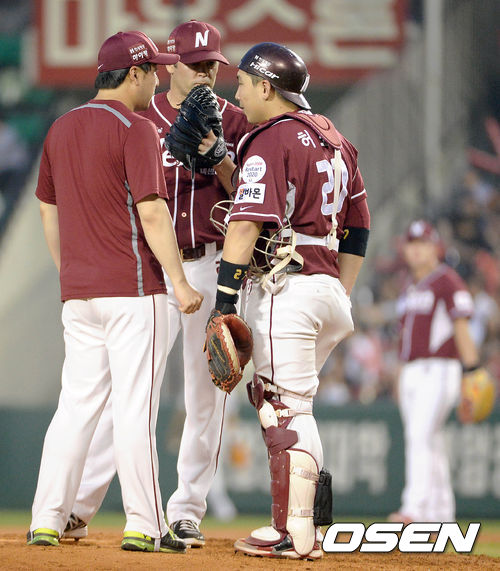 27일 오후 서울 잠실야구장에서 열린 2013 한국야쿠르트 세븐프로야구 LG 트윈스와 넥센 히어로즈의 경기, 2회말 2사 만루에서 넥센 나이트가 마운드를 방문한 포수 허도환과 이야기를 나누고 있다.