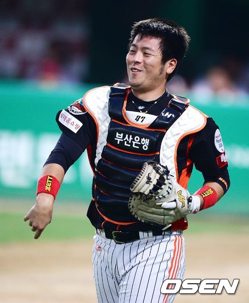 27일 오후 광주 무등경기장에서 열린 '2013 한국야쿠르트 세븐 프로야구' KIA 타이거즈와 롯데 자이언츠의 경기, 2회말 2사에서 롯데 강민호가 KIA 김주형의 파울플라이를 타구를 잡고 미소짓고 있다.