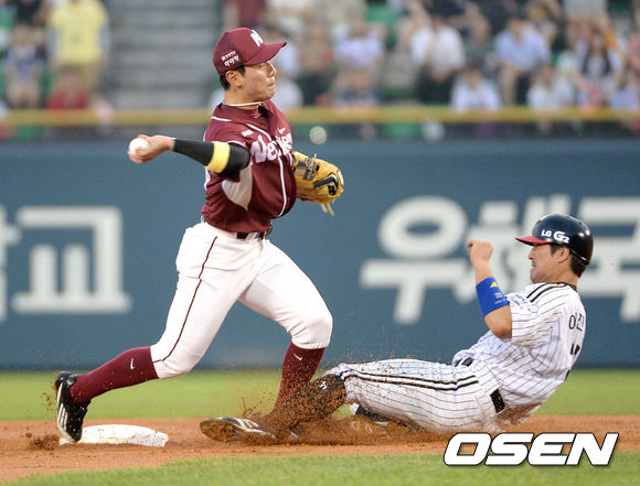27일 오후 서울 잠실야구장에서 열린 2013 한국야쿠르트 세븐프로야구 LG 트윈스와 넥센 히어로즈의 경기, 1회말 1사 1,2루에서 LG 정의윤의 병살타 때 넥센 서건창이 1루루자 이진영을 포스아웃 처리하고 있다.