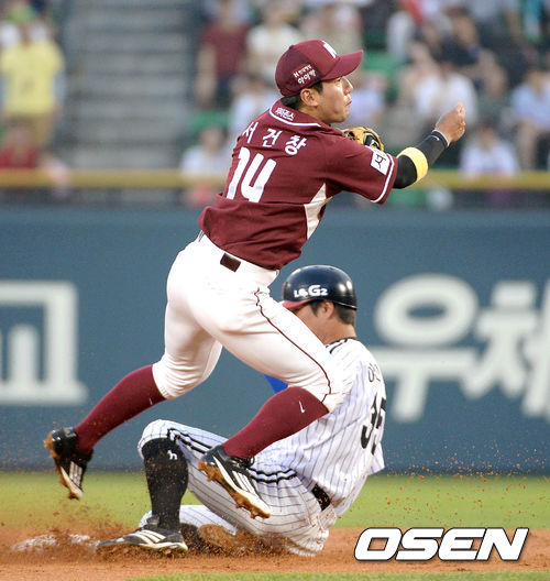 27일 오후 서울 잠실야구장에서 열린 2013 한국야쿠르트 세븐프로야구 LG 트윈스와 넥센 히어로즈의 경기, 1회말 1사 1,2루에서 LG 정의윤의 병살타 때 넥센 서건창이 1루루자 이진영을 포스아웃 처리하고 있다.