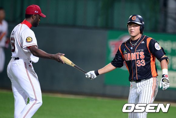 27일 오후 광주 무등경기장에서 열린 '2013 한국야쿠르트 세븐 프로야구' KIA 타이거즈와 롯데 자이언츠의 경기, 4회초 2사 1루에서 롯데 정훈이 삼진을 당하며 배트를 놓치자 KIA 소사가 주워 전해주고 있다.