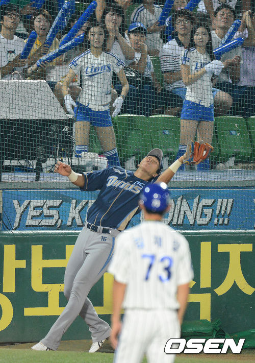 27일 오후 대구구장에서 열린 '2013 한국야쿠르트 세븐 프로야구' 삼성 라이온즈 와 NC 다이노스 경기, 4회말 선두타자 최형우의 3루 펜스근처 파울타구를 NC 모창민 3루수가 포구하며 아웃처리 시키고 있다.
