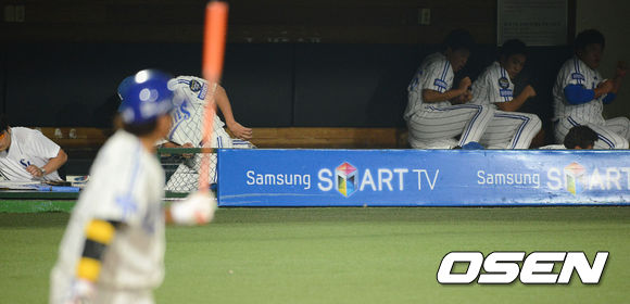27일 오후 대구구장에서 열린 '2013 한국야쿠르트 세븐 프로야구' 삼성 라이온즈 와 NC 다이노스 경기, 4회말 2사 박석민의 직선 파울타구가 삼성 덕아웃을 향하자 선수들이 황급히 피하고 있다.