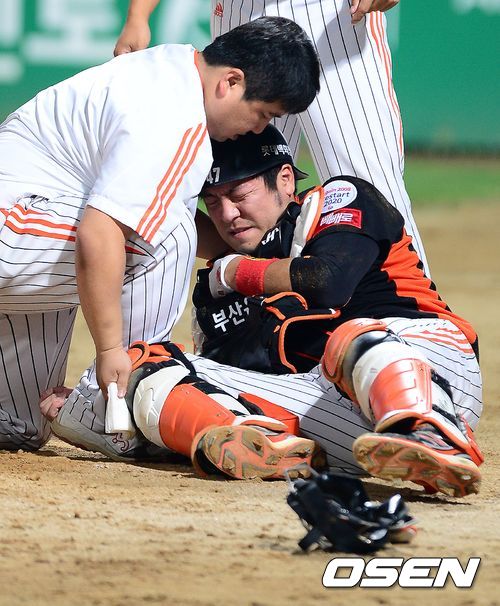 27일 오후 광주 무등경기장에서 열린 '2013 한국야쿠르트 세븐 프로야구' KIA 타이거즈와 롯데 자이언츠의 경기, 4회말 1사 2루에서 롯데 강민호가 KIA 나지완의 파울 타구에 맞아 괴로워하고 있다. 강민호는 용덕한과 교체.