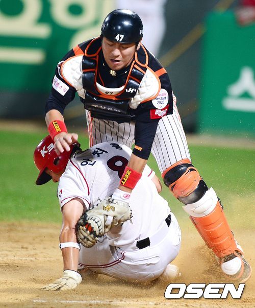 27일 오후 광주 무등경기장에서 열린 '2013 한국야쿠르트 세븐 프로야구' KIA 타이거즈와 롯데 자이언츠의 경기, 4회말 1사 1.3루에서 KIA가 더블스틸을 시도하며 3루주자 안치홍이 롯데 강민호의 태그에 앞서 홈에서 세이프되고 있다.