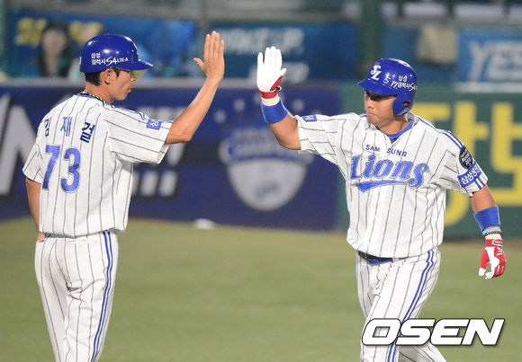 27일 오후 대구구장에서 열린 '2013 한국야쿠르트 세븐 프로야구' 삼성 라이온즈 와 NC 다이노스 경기, 5회말 1사 김태완 좌월솔로 홈런을 날리고 김재걸 코치의 환영을 받으며 홈인하고 있다.