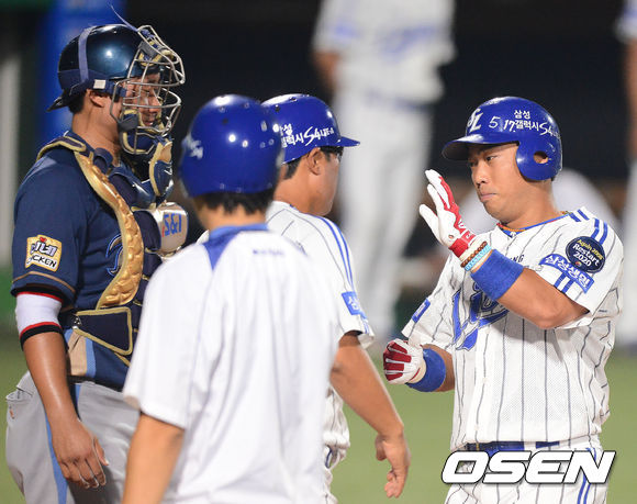 27일 오후 대구구장에서 열린 '2013 한국야쿠르트 세븐 프로야구' 삼성 라이온즈 와 NC 다이노스 경기, 5회말 1사 김태완 좌월솔로 홈런을 날리고 홈인 김태균 코치의 환영을 받고 있다.