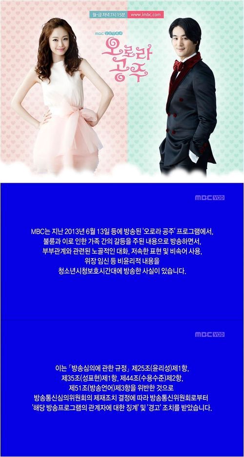 ‘오로라공주’는 27일 71회가 방영되기에 앞서 사과 방송을 내보냈다. MBC는 “이 방송은 방송통신심의위원회의 제재조치 결정에 따른 방송통신위원회 결정사항 고지방송”이라면서 “MBC는 지난 2013년 6월 13일 등에 방송된 ‘오로라공주’ 프로그램에서 불륜과 이로 인한 가족 간의 갈등을 주된 내용으로 방송하면서 부부관계와 관련된 노골적인 대화, 저속한 표현 및 비속어 사용, 위장 임신 등 비윤리적인 내용을 청소년시청보호시간대에 방송한 사실이 있다”고 알렸다.
