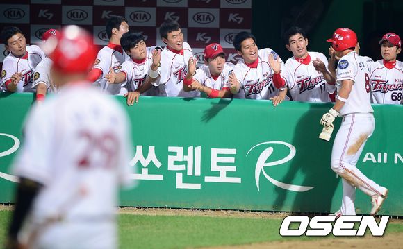 27일 오후 광주 무등경기장에서 열린 '2013 한국야쿠르트 세븐 프로야구' KIA 타이거즈와 롯데 자이언츠의 경기, 4회말 1사 1.3루에서 KIA 3루주자 안치홍이 1루주자 신종길과 더블스틸을 시도하며 홈에서 세이프, 동료선수들과 하이파이브를 하고 있다.