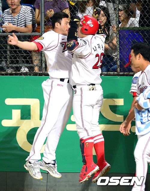 27일 오후 광주 무등경기장에서 열린 '2013 한국야쿠르트 세븐 프로야구' KIA 타이거즈와 롯데 자이언츠의 경기, 7회말 무사에서 KIA 나지완이 동점 솔로포를 날리고 더그아웃에서 서재응과 기뻐하고 있다.
