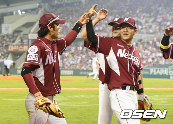 27일 오후 서울 잠실야구장에서 열린 2013 한국야쿠르트 세븐프로야구 LG 트윈스와 넥센 히어로즈의 경기, 7회말 2사 1루에서 넥센 장기영이 LG 이진영의 잘 맞은 타구를 호수비로 처리하고 동료들과 하이파이브를 하며 덕아웃으로 가고 있다.