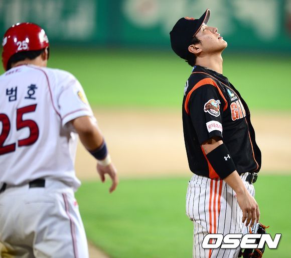 27일 오후 광주 무등경기장에서 열린 '2013 한국야쿠르트 세븐 프로야구' KIA 타이거즈와 롯데 자이언츠의 경기, 7회말 무사 1루에서 김주형의 우전안타에 1루주자 이범호가 3루에서 세이프되자 롯데 황재균이 아쉬워하고 있다.