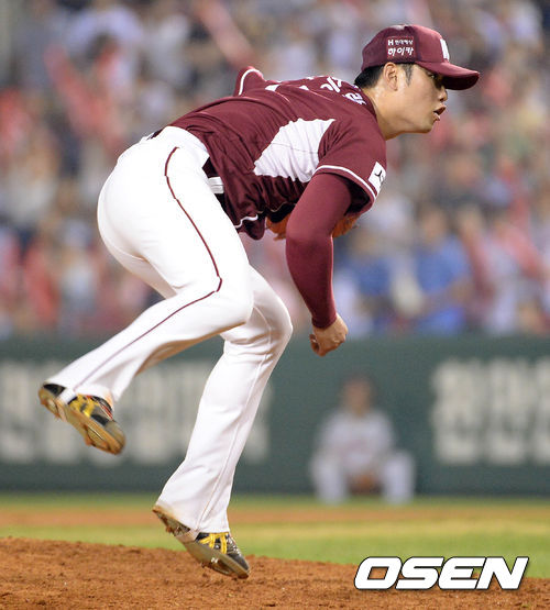 27일 오후 서울 잠실야구장에서 열린 2013 한국야쿠르트 세븐프로야구 LG 트윈스와 넥센 히어로즈의 경기, 9회말 넥센 손승락이 힘차게 공을 던지고 있다.