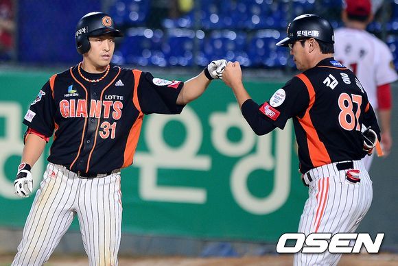 27일 오후 광주 무등경기장에서 열린 '2013 한국야쿠르트 세븐 프로야구' KIA 타이거즈와 롯데 자이언츠의 경기, 9회초 2사 2루에서 롯데 손아섭이 1타점 우전 적시타를 날리고 기뻐하고 있다.