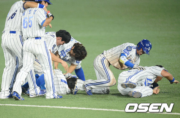9회말 2사 1,2루 김상수 끝내기 안타를 날리고 동료들로 부터 축하를 받고 있다./ ajyoung@osen.co.kr