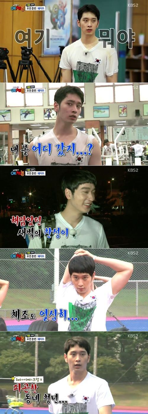 그룹 2PM의 찬성이 '예체능' 촬영 중 국가대표들의 훈련 강도를 체험하다가 볼과 웃음기를 잃어버린 모습을 내비쳤다.
