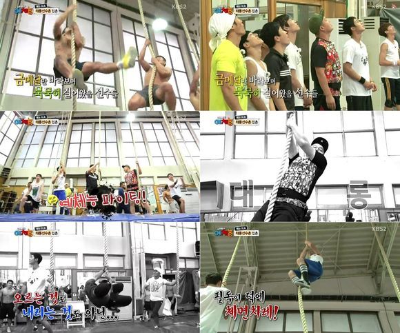 앞서 국가대표 선수들의 한 차례 시범이 있은 뒤, 곧바로 밧줄 오르기에 도전한 '예체능' 멤버들은 노력에도 결국 만족스런 결과물을 얻진 못했다. 전직 씨름 천하장사인 강호동과 이만기는 겨우 대롱대롱 매달리는 모습을, 이수근은 올라가는 건지 내려가는 건지 알 수 없는 아리송한 동작만 반복해 보는 이의 웃음을 자아냈다.