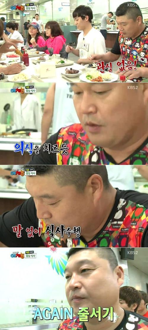 예능프로그램 사상 최초로 허용된 식사인 만큼 멤버들은 모두 기대에 찬 모습으로 식사에 임했다. 특히 평소 방송 중에도 먹는 것에 유독 예민한 모습을 내비쳤던 강호동은 이날 방송 중에서 가장(?) 진지한 모습을 드러내 눈길을 끌었다.