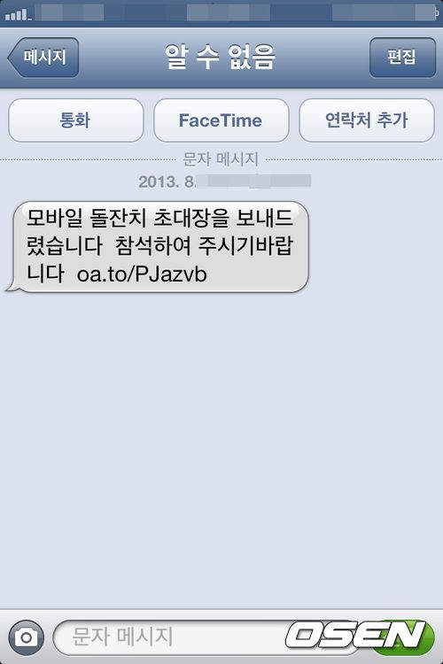 [OSEN=이슈팀] 돌잔치 문자 사기가 극성이다. 이는 모바일 초대장을 가장, 접속을 유도해 개인정보나 돈을 빼가는 신종 '스미싱' 사기의 일종이다.