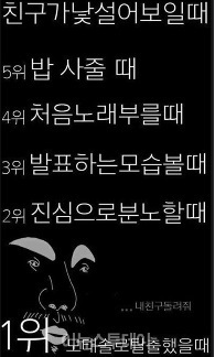 ‘친구가 달라보일 때’ 4위는 처음 노리 부를 때다. 노래방에서 분위기를 잡고 평소와는 다른 목소리의 친구를 볼 때다.