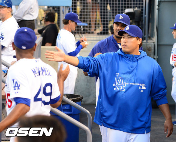 28일 (이하 한국시간) 미국 캘리포니아주 로스앤젤레스 다저스타디움에서 열린 2013 메이저리그 LA 다저스와 시카고 컵스의 경기, 덕아웃에서 류현진이 동료들과 하이파이브를 하고 있다.