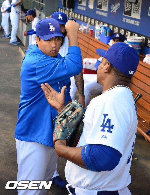 28일 (이하 한국시간) 미국 캘리포니아주 로스앤젤레스 다저스타디움에서 열린 2013 메이저리그 LA 다저스와 시카고 컵스의 경기, 덕아웃에서 류현진이 유리베와 하이파이브를 하고 있다.