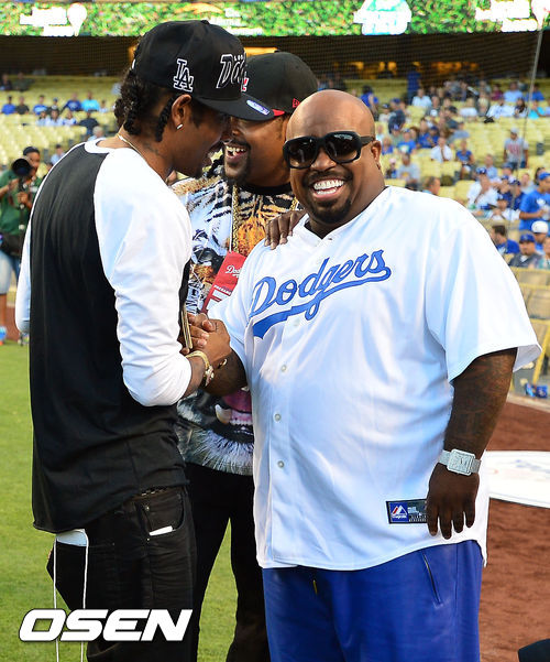 28일 (이하 한국시간) 미국 캘리포니아주 로스앤젤레스 다저스타디움에서 열린 2013 메이저리그 LA 다저스와 시카고 컵스의 경기, 마운드 위에서 그래미상 수상자 씨로그린이 시구 전 환하게 미소짓고 있다.