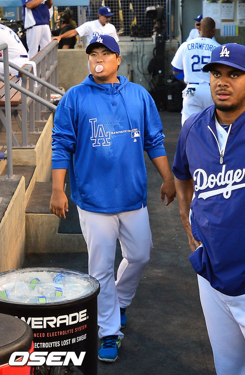 28일 (이하 한국시간) 미국 캘리포니아주 로스앤젤레스 다저스타디움에서 열린 2013 메이저리그 LA 다저스와 시카고 컵스의 경기, 덕아웃에서 류현진이 풍선껌을 불고 있다.