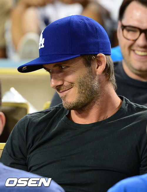 28일 (이하 한국시간) 미국 캘리포니아주 로스앤젤레스 다저스타디움에서 열린 2013 메이저리그 LA 다저스와 시카고 컵스의 경기, 은퇴한 잉글랜드 축구스타 데이빗 베컴(38)이 관중석에서 즐거운 시간을 보내고 있다.