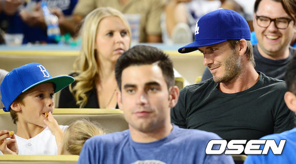 28일 (이하 한국시간) 미국 캘리포니아주 로스앤젤레스 다저스타디움에서 열린 2013 메이저리그 LA 다저스와 시카고 컵스의 경기, 은퇴한 잉글랜드 축구스타 데이빗 베컴(38)이 자녀들과 함께 관중석에서 즐거운 시간을 보내고 있다.