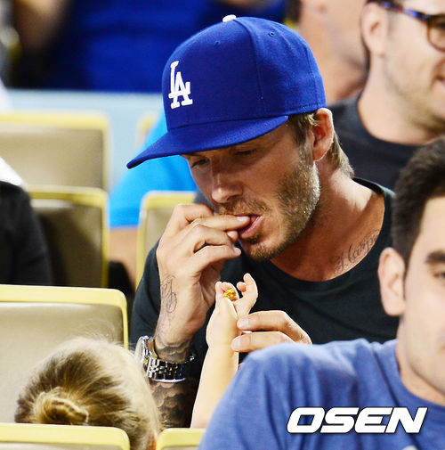 28일 (이하 한국시간) 미국 캘리포니아주 로스앤젤레스 다저스타디움에서 열린 2013 메이저리그 LA 다저스와 시카고 컵스의 경기, 은퇴한 잉글랜드 축구스타 데이빗 베컴(38)이 자녀들과 함께 관중석에서 즐거운 시간을 보내고 있다.