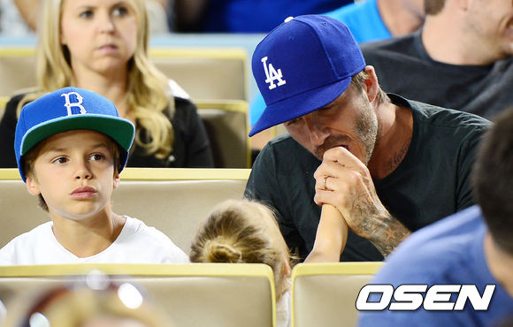 28일 (이하 한국시간) 미국 캘리포니아주 로스앤젤레스 다저스타디움에서 열린 2013 메이저리그 LA 다저스와 시카고 컵스의 경기, 은퇴한 잉글랜드 축구스타 데이빗 베컴(38)이 자녀들과 함께 관중석에서 즐거운 시간을 보내고 있다.