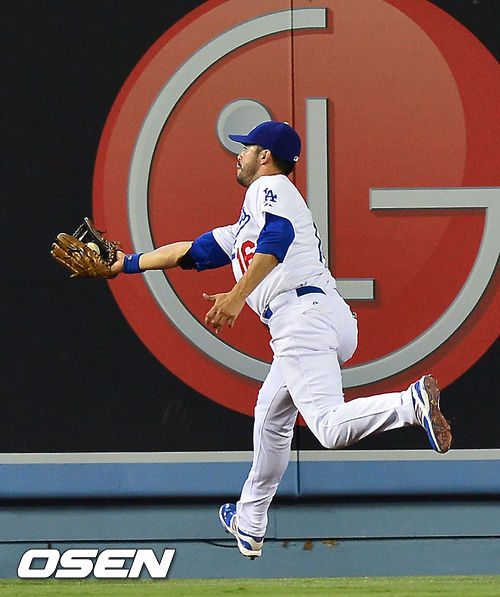 28일 (이하 한국시간) 미국 캘리포니아주 로스앤젤레스 다저스타디움에서 열린 2013 메이저리그 LA 다저스와 시카고 컵스의 경기, 2회초 2사 주자 없는 상황에서 시카고 컵스의 길레스피의 타구를 다저스 중견수 안드레 이디어가 달려가며 잡아내고 있다.