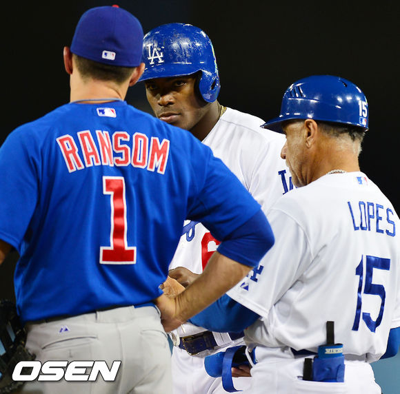 28일 (이하 한국시간) 미국 캘리포니아주 로스앤젤레스 다저스타디움에서 열린 2013 메이저리그 LA 다저스와 시카고 컵스의 경기, 3회말 1사 주자 없는 상황에서 다저스의 푸이그가 좌전 안타를 날린 후 1루에서 로페스 코치와 하이파이브를 하고 있다.