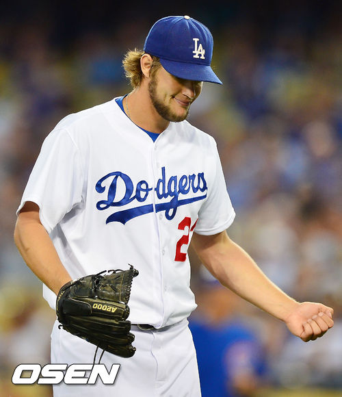 28일 (이하 한국시간) 미국 캘리포니아주 로스앤젤레스 다저스타디움에서 열린 2013 메이저리그 LA 다저스와 시카고 컵스의 경기, 1회를 마친 클레이튼 커쇼가 글러브를 치며 기뻐하고 있다.