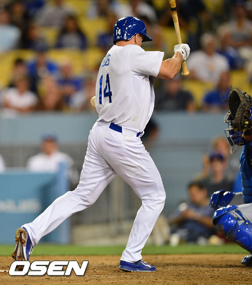 28일 (이하 한국시간) 미국 캘리포니아주 로스앤젤레스 다저스타디움에서 열린 2013 메이저리그 LA 다저스와 시카고 컵스의 경기, 8회말 1사 주자 1루 다저스 마크 엘리스가 타석에서 볼을 맞고 있다.