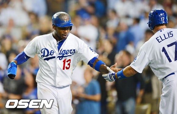 28일 (이하 한국시간) 미국 캘리포니아주 로스앤젤레스 다저스타디움에서 열린 2013 메이저리그 LA 다저스와 시카고 컵스의 경기, 8회말 1사 주자 1,2루 다저스 이디어의 중전 1타점 적시타때 홈을 밟은 라미레스가 엘리스와 기쁨을 나누고 있다.