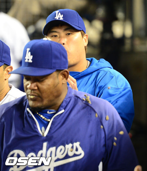 28일 (이하 한국시간) 미국 캘리포니아주 로스앤젤레스 다저스타디움에서 열린 2013 메이저리그 LA 다저스와 시카고 컵스의 경기, 류현진이 덕아웃에서 유리베에게 해바라기씨를 던지고 있다.