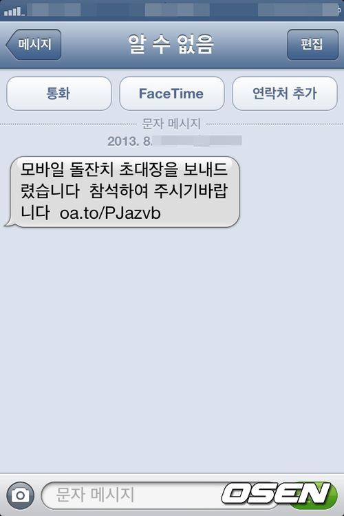 [OSEN=이슈팀] 돌잔치 신종 문자 사기가 놀라움을 안기고 있다. 모바일 초대장을 가장하여 돈을 빼가는 신종 '스미싱' 사기의 일종이다. 접속만으로도 개인정보나 돈을 빼갈 수 있는 점 때문이다.