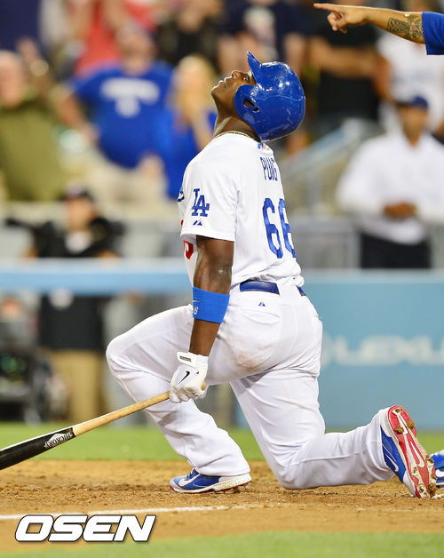 9회말 2사 1루 다저스 푸이그가 1루수 플라이를 날리며 아쉬워 하고 있다. / rumi@osen.co.kr
