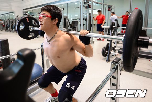 지난 6월 28일 대구 삼성전에서 투구 도중 왼 옆구리 근육파열상을 입은 KIA 양현종이 클럽하우스 웨이트실에서 훈련을 하고 있다. 선동렬 감독은 지난 27일 롯데전에 앞서 "아직 1주일 정도 재활을 기다려야 한다. 재활을 마치면 그때 다시 정밀검진을 해서 상태를 봐야 한다. 괜찮다고 해도 실전을 거쳐야 된다. 아무래도 돌아오기는 쉽지는 않을 것 같다"고 말했다.