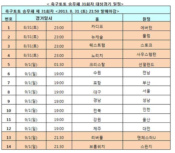 국민체육진흥공단(www.kspo.or.kr)이 발행하는 체육진흥투표권 수탁사업자인 스포츠토토(www.sportstoto.co.kr)는 오는 31일부터 9월 1일 벌어지는 잉글랜드 프리미어리그(EPL) 7경기 및 K리그 클래식 7경기 등 총 14경기를 대상으로 한 축구토토 승무패 31회차 게임을 발행한다고 밝혔다.