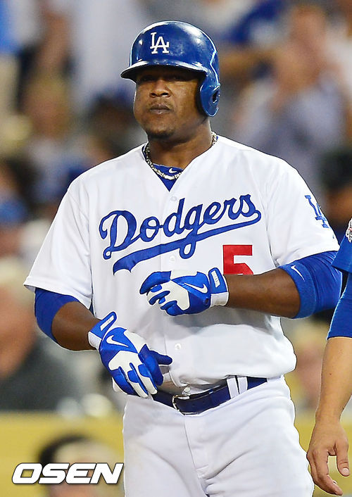 6회말 2사 2루 1타점 적시타를 날린 다저스 후안 유리베가 기뻐하고 있다. / rumi@osen.co.kr