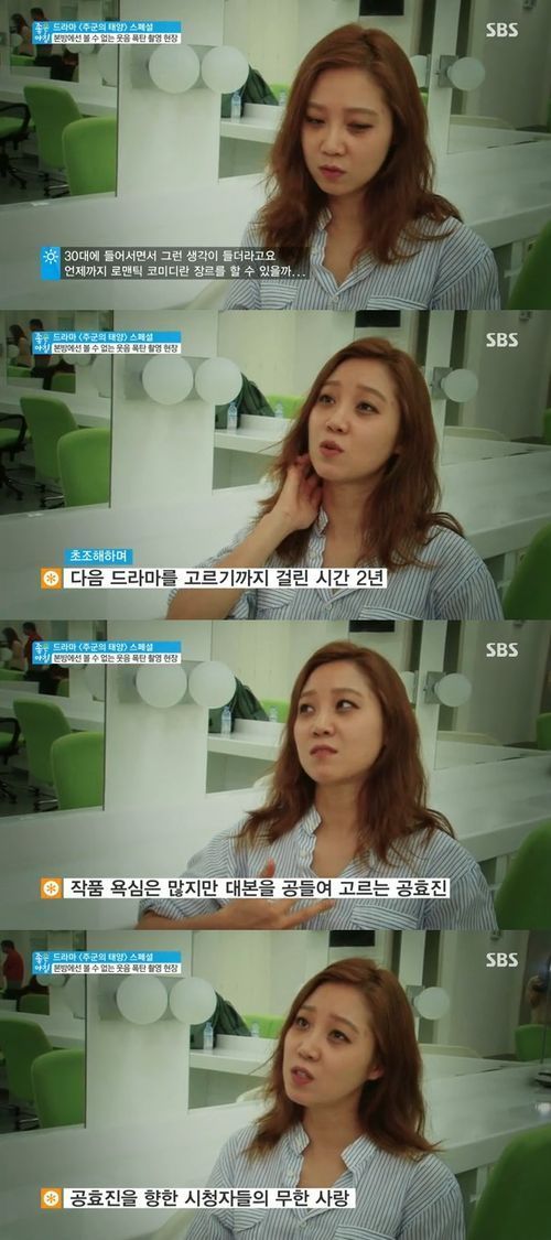 공효진은 28일 방송된 SBS '좋은아침'에서 "30대에 들어서면서 언제까지 로맨틱 코미디 장르의 작품을 할 수 있을까라는 생각이 들더라"라고 심정을 토로했다.